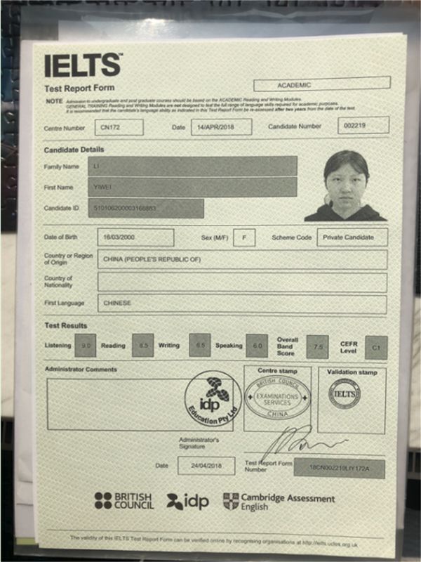 双语班学生不仅德语出色,他们通过在我校四年半的英语学习(双语班同学从初一到高二上学期结束都接受与我校普通英语班同样的英语授课),他们的英语成绩更是毫不逊色。李一玮同学于2018年4月参加了雅思考试,取得了雅思C1的好成绩。